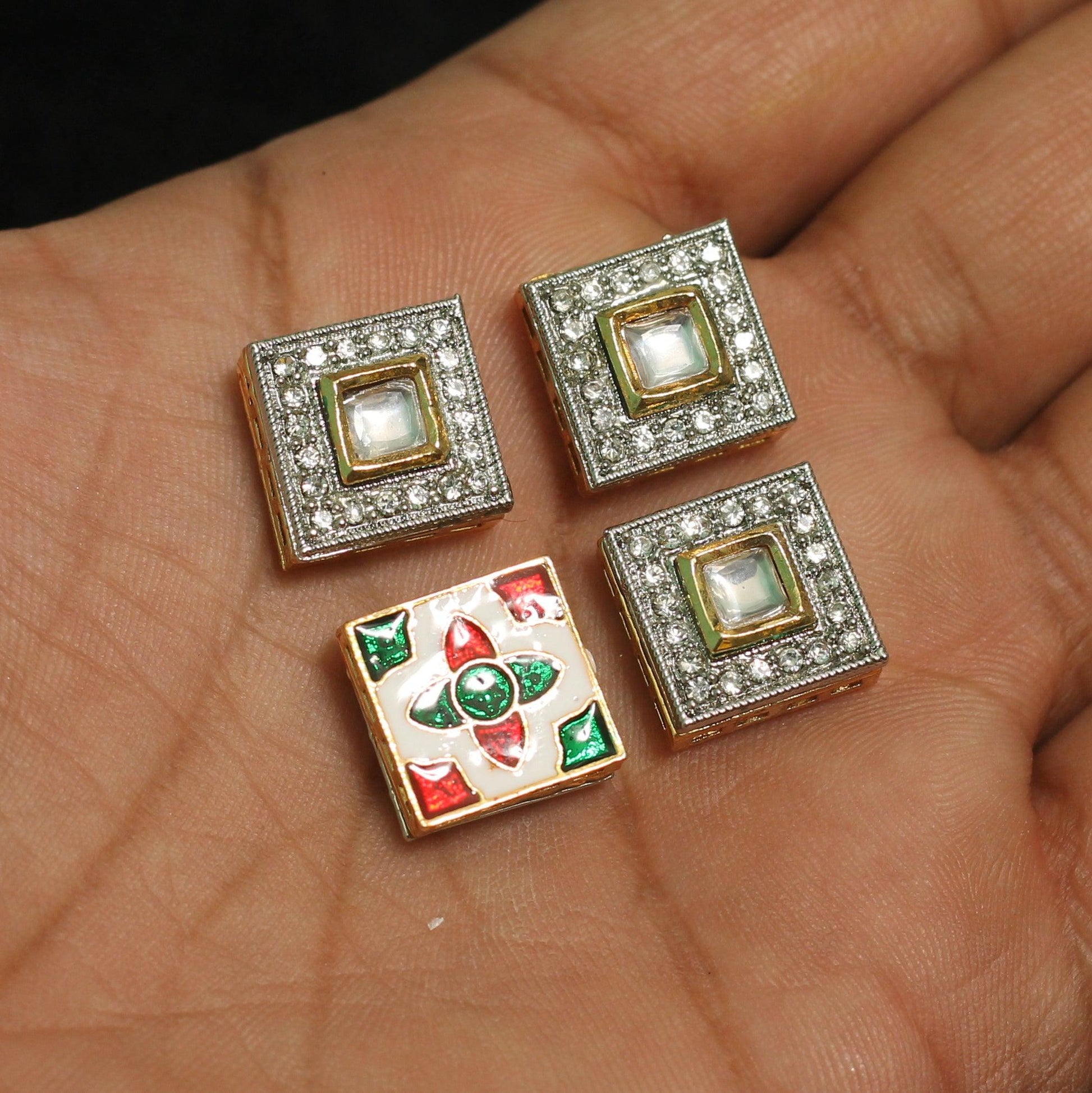 14mm, Kundan Connectors Square Golden - Golden / Kundan / 4 Pcs